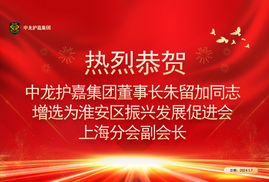 2024年1月7日,淮安市淮安区振兴发展促进会上海分会第一届会员代表大会第二次会议在上海顺利召开。中龙护嘉集团董事长朱留加同志在本次会议中增选为淮安市淮安区振兴发展促进会上海分会副会长,并发表了重要讲话。